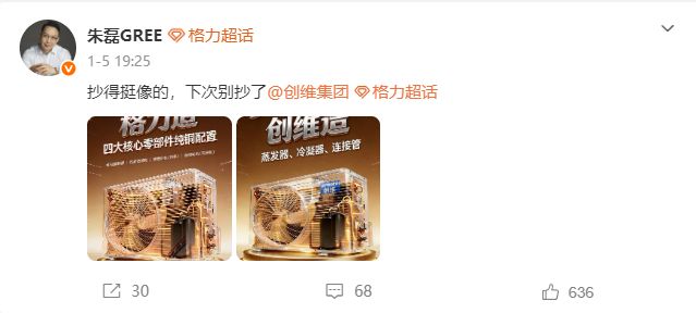 1月5日晚,朱磊在個人微博貼出兩張相似度極高的圖片,并配文稱:“抄得挺像的,下次別抄了@創(chuàng)維集團(tuán)。”這兩張圖,一張是格力電器的官方海報,另一張是來自創(chuàng)維空調(diào)官方微信視頻號的視頻截圖,截圖畫面也是一張創(chuàng)維空調(diào)的宣傳海報。